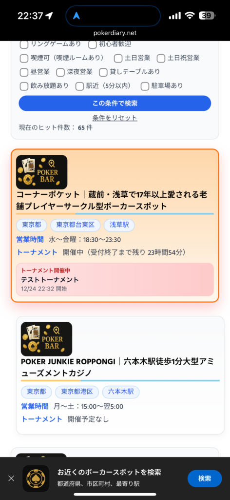 - トーナメント投稿をすると、全検索UI・地域アーカイブでの表示順位が優遇され、条件が同じ店舗より上位表示されやすくなります。 新規流入の受け皿としても機能します。